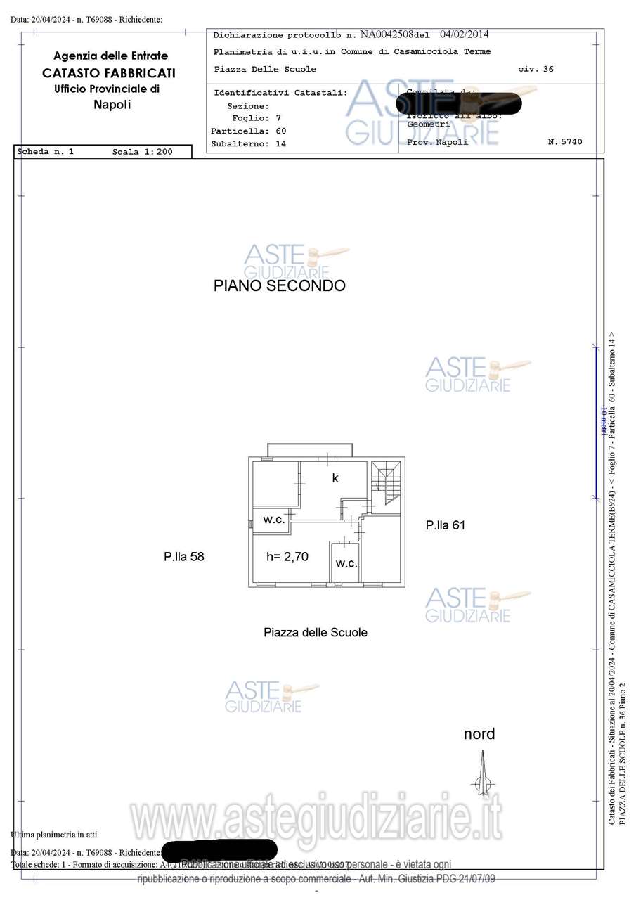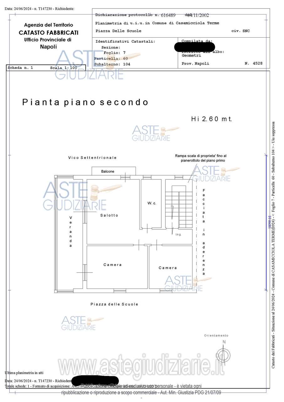 Piena proprietà (quota di 1/1) di UNITA’ IMMOBILIARE, attualmente destinata ad abitazione e suddivisa in due distinte unità immobiliari, ubicata in Casamicciola Terme (Na), alla Piazza delle Scuole n. 36, secondo piano.