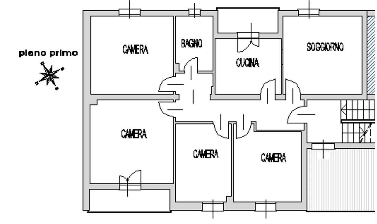 Composto da: ingresso-disimpegno, soggiorno, cucina-pranzo, camera matrimoniale, due camere doppie e una singola, bagno oltre a magazzino e box auto.