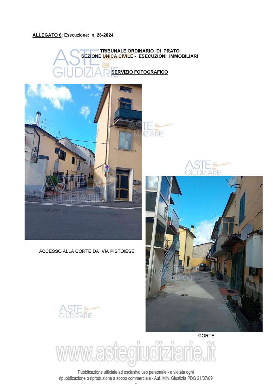 Diritto di piena proprietà di una unità immobiliare a uso residenziale rappresentata da un appartamento sito in Prato Via Pistoiese 721/7. L’accesso è da Via Pistoiese attraverso il passaggio nella corte, la cui entrata è tra il civico 719 ed il civico 723 della predetta via, si prosegue fino a trovare il civico 721/7 ed attraverso un ingresso a comune con altra unità immobiliare, dalla porta a destra, si accede all’appartamento oggetto di vendita che è così composto: al piano terra troviamo ingresso, ripostiglio, bagno, cucinotto e locale unico giorno/notte, attraverso la scala a chiocciola, tramite un disimpegno, si accede a locale sottotetto. Il tutto per una superficie commerciale di mq. 45,70.