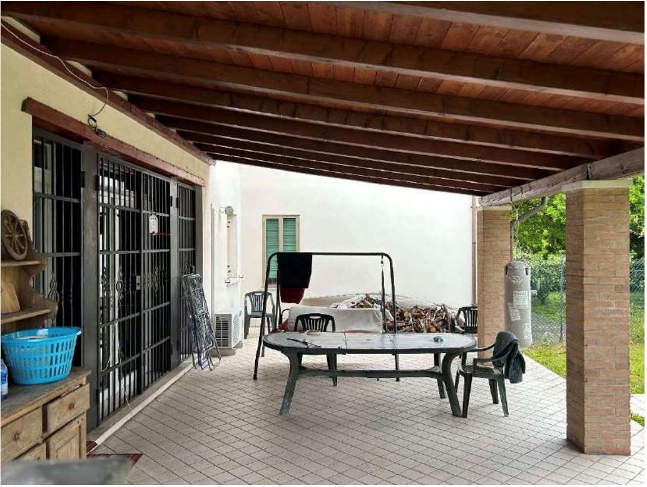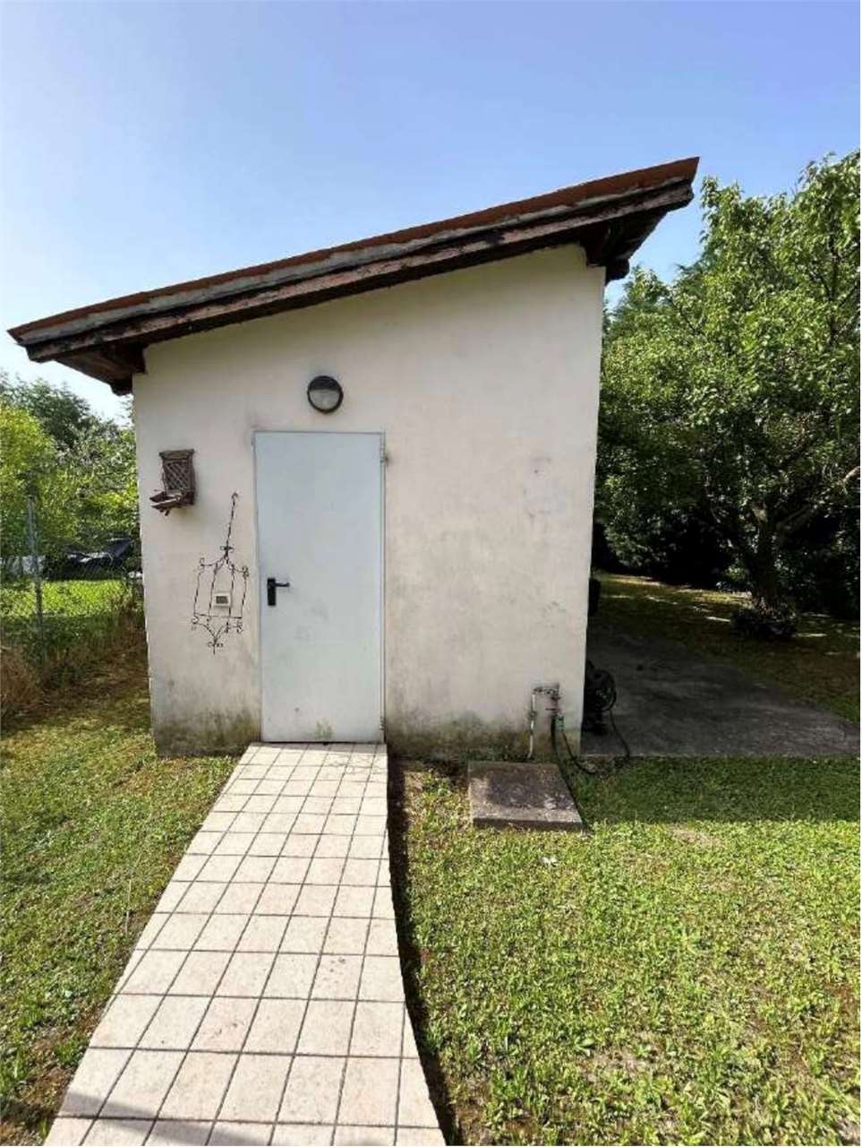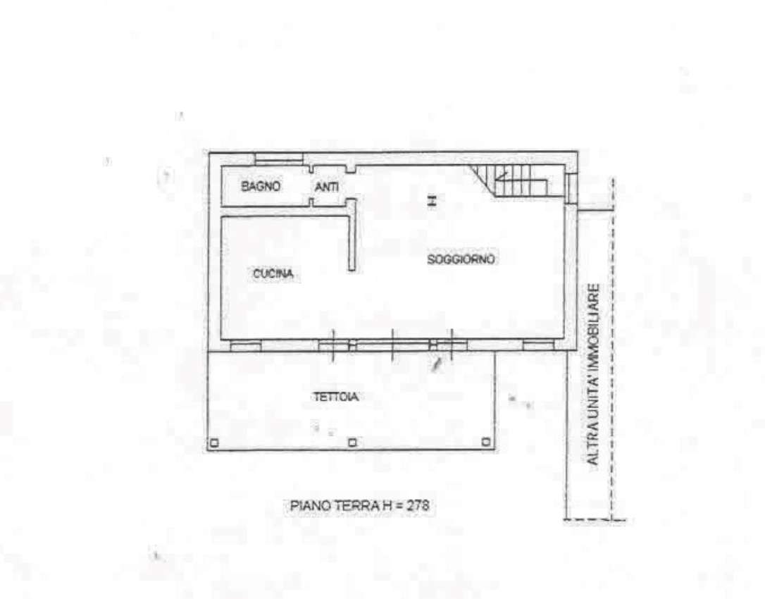 Porzione di fabbricato, su due livelli (piani terra e primo) composta al piano terra da soggiorno, cucina, antibagno, bagno e tettoia, al piano primo da due camere, disimpegno, bagno, guardaroba e ripostiglio, collegati da un vano scale interno, con annesso corpo di fabbrica staccato sviluppantesi su un livello (piano terra) di 21 mq, adibito a garage;