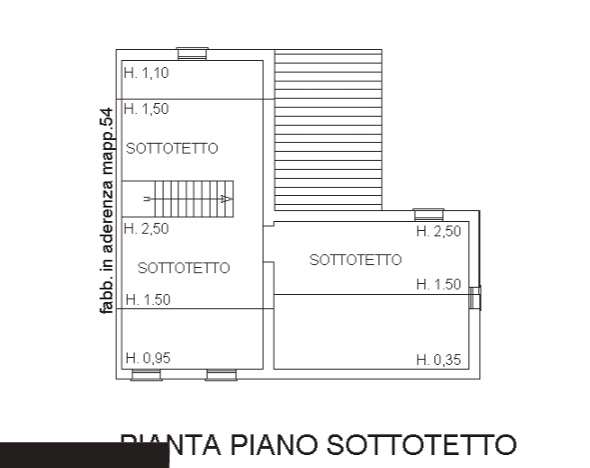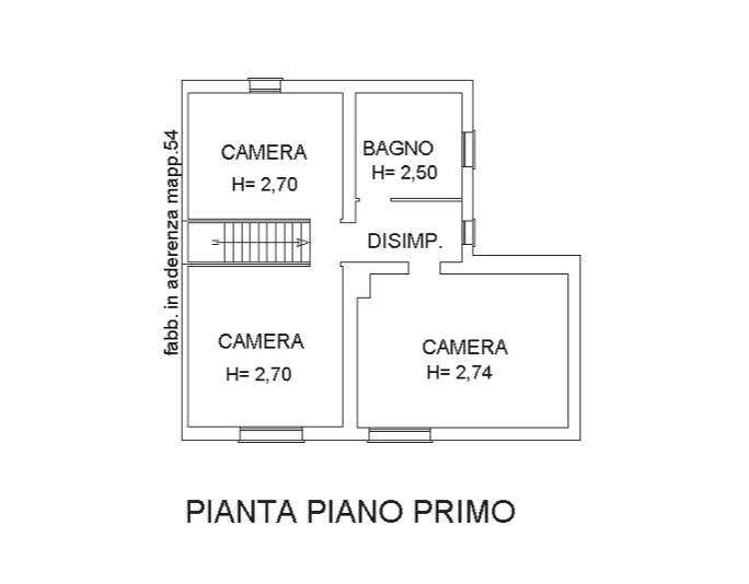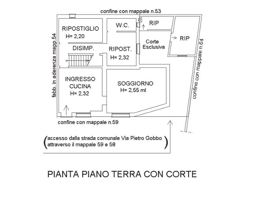 Casa indipendente su tre piano fuori terra: il piano terra composto da ingresso-cucina, soggiorno, scala, wc, tre ripostigli con area scoperta esclusiva; il piano primo composto da corridoio, tre camere e bagno; secondo piano a soffitta.